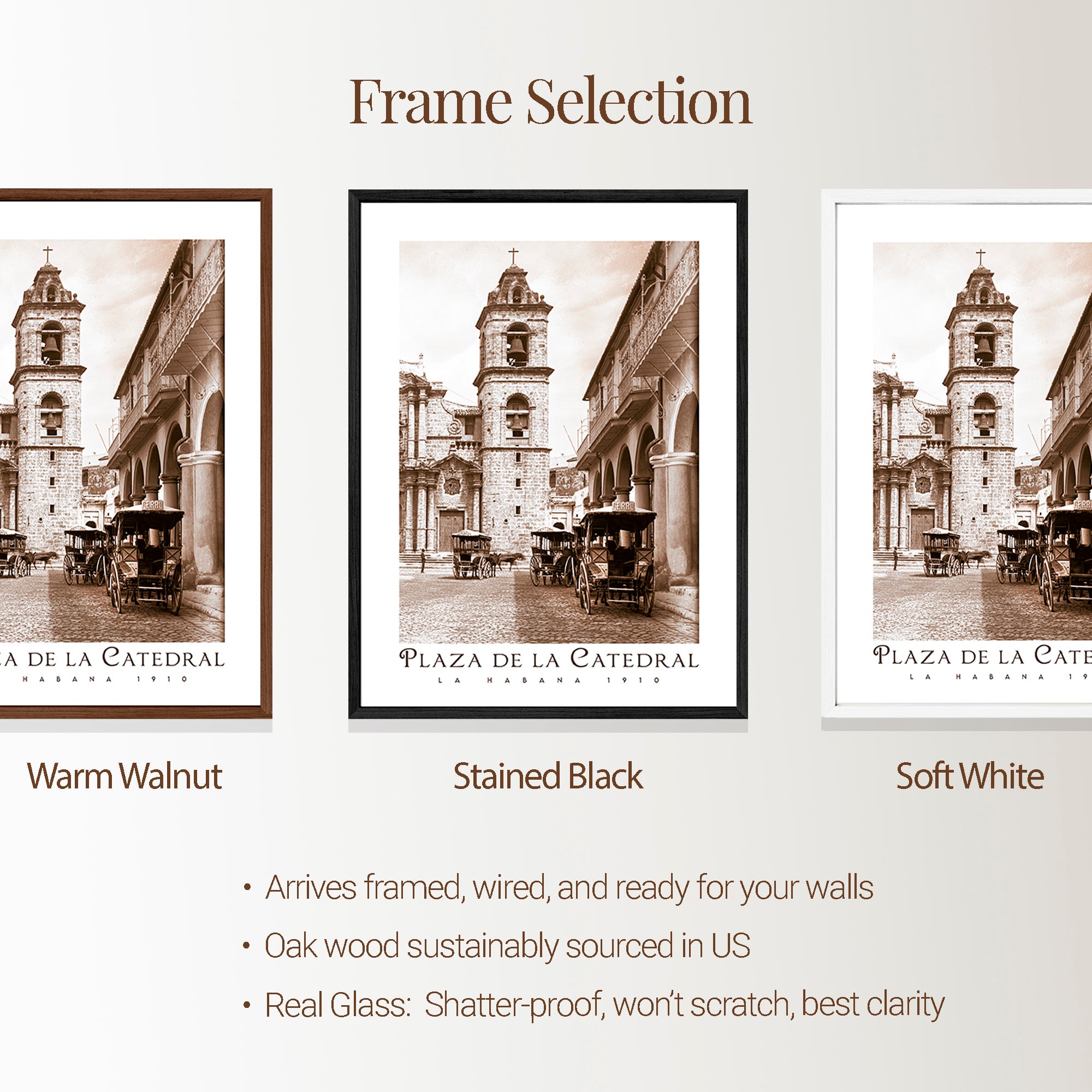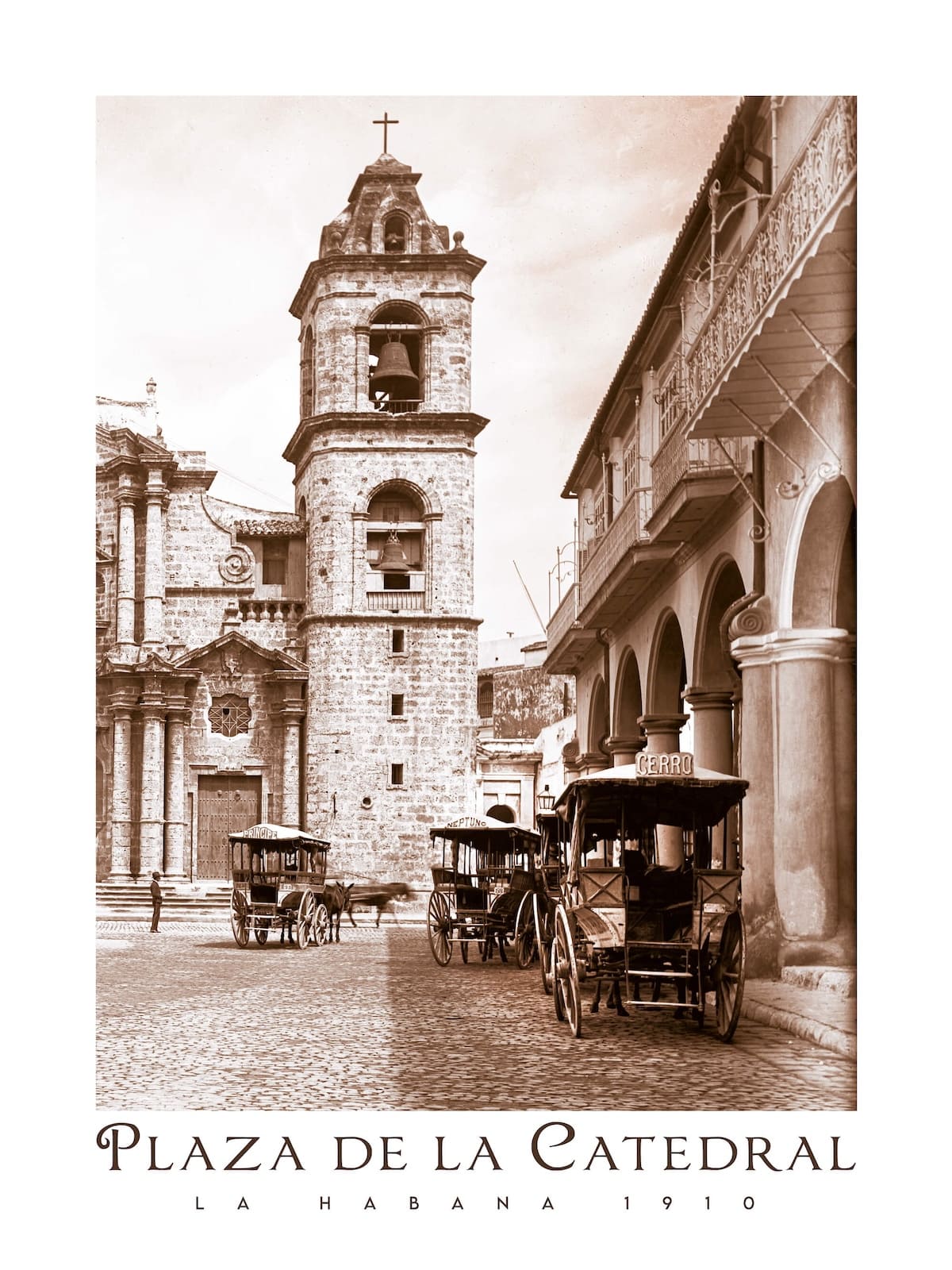 Our vintage-inspired travel poster preserves this quiet scene in Old Havana, before automobiles arrived and the 20th century transformed both the plaza and the city’s unhurried pace.