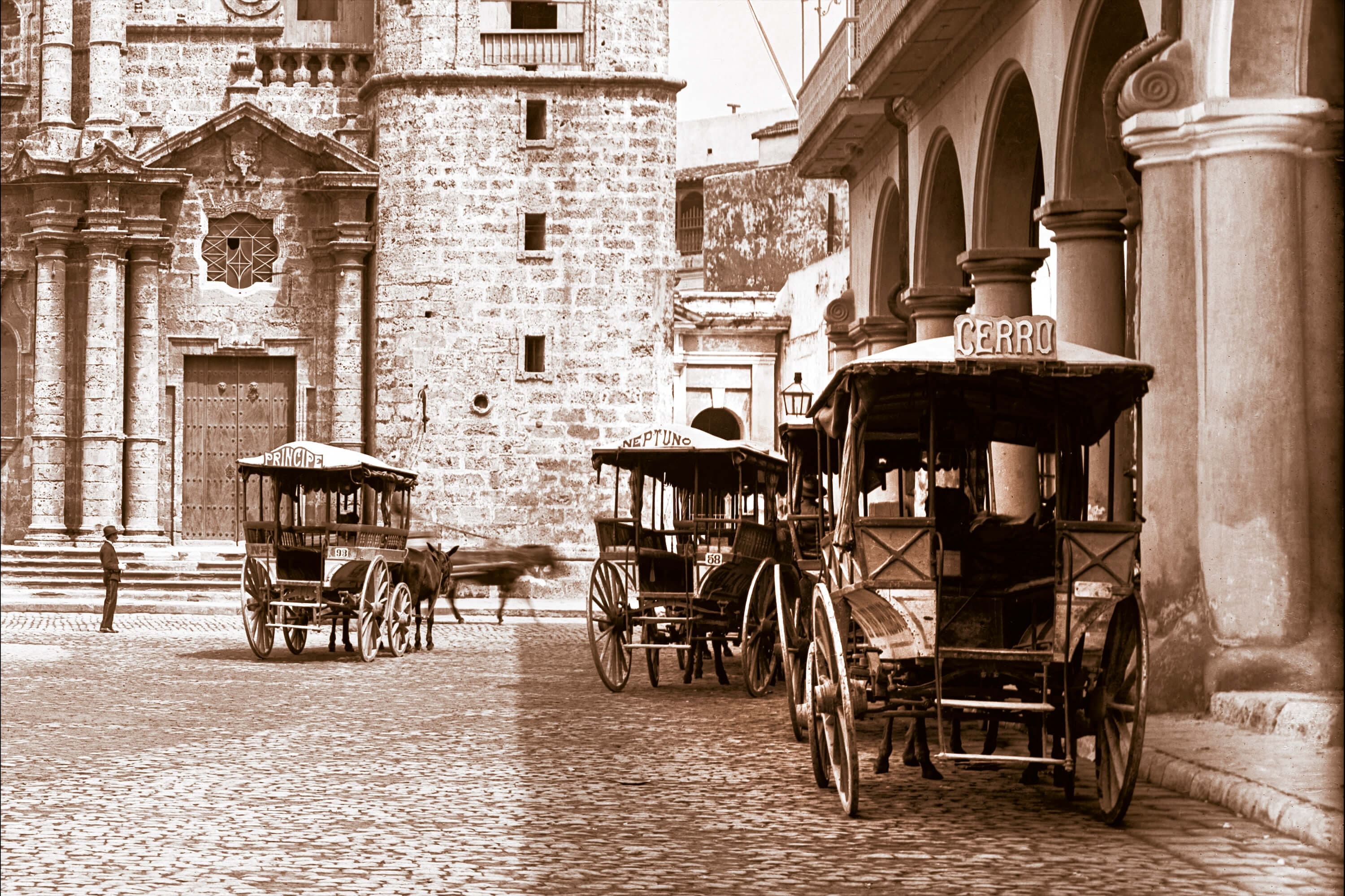 An unusual photograph from the early 1900s, this image captures Havana’s Plaza de la Catedral with horse-drawn carriages waiting in the shade of Spanish Colonial buildings.
